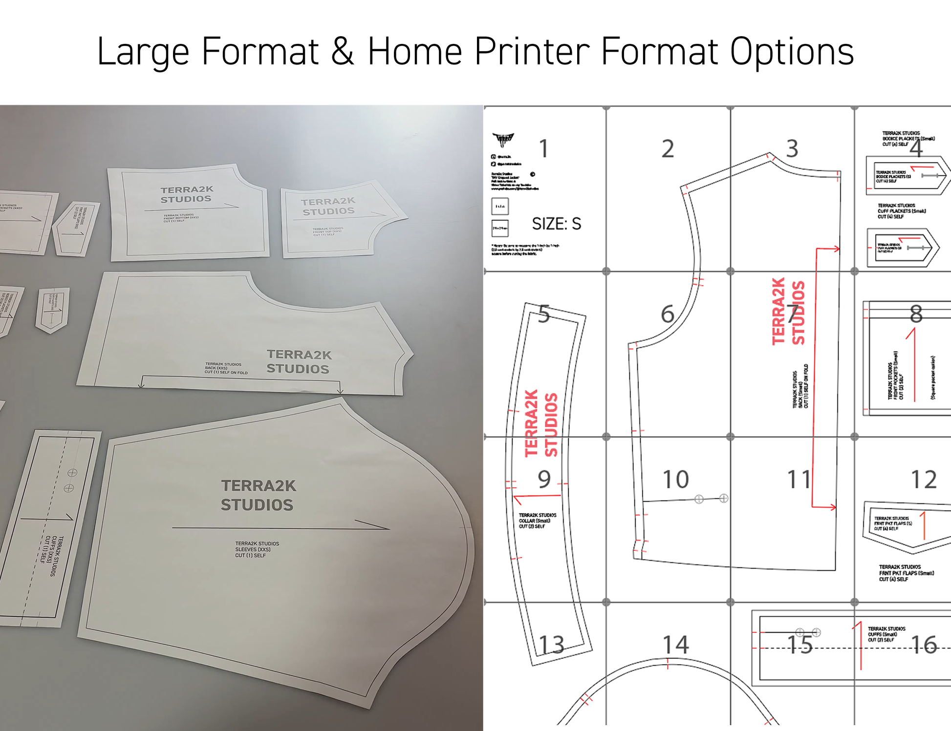 Print on 24" × 36" paper (also known as "D size" paper). This typically costs $2–5 per sheet at a print shop using engineering paper. Cut out the pieces, and your pattern is ready to sew. Ensure the scale is correct before beginning.